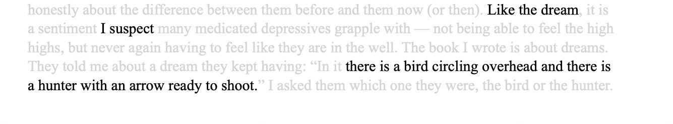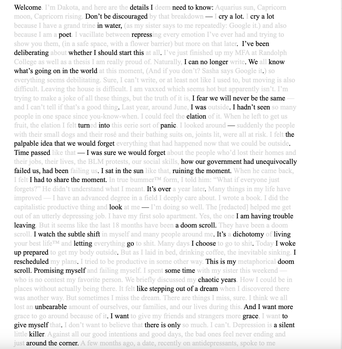 This is an erasure I made from my first Substack essay which was made three years ago now. I know I’m not here much, but this seemed like a fitting meet.